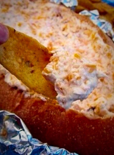 In the days of yore, we always served this in a bread bowl…we usually don’t bother anymore and just use a trusty Pyrex dish. Keep in mind though, tailgate parties and potluck fetes would benefit greatly from ye olde bread bowl as you don’t have to keep track of your property!
