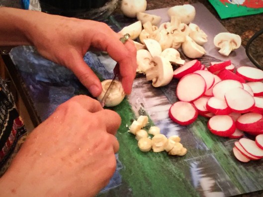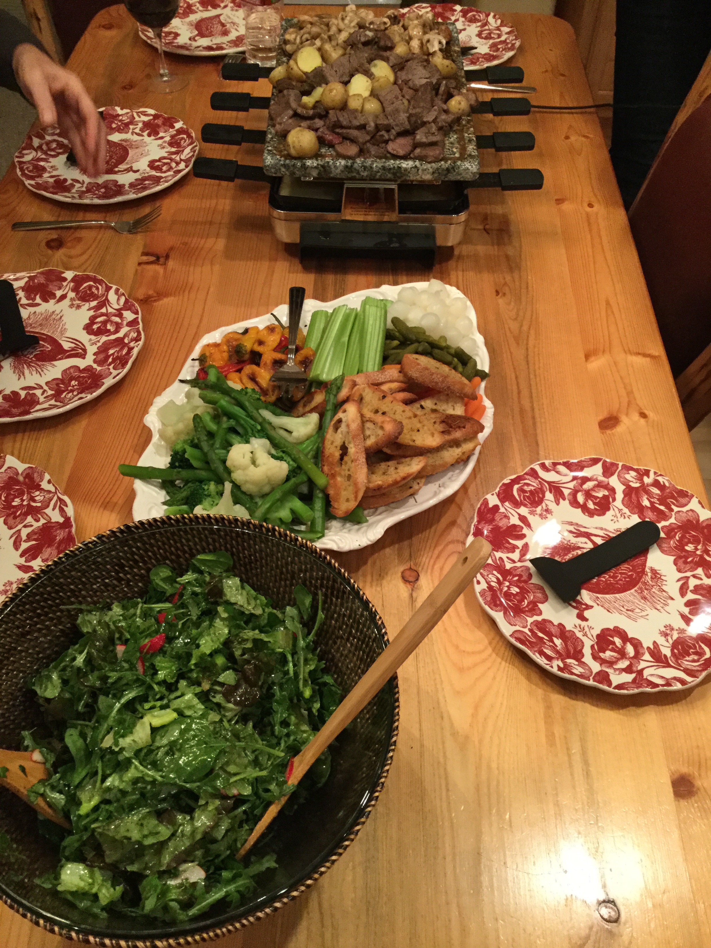 After tossing a quick, healthy salad, the crowd gathered round for the feast. Everyone served themselves, picking their faves…pouring the melted, heavenly cheese on top. Yum!!!