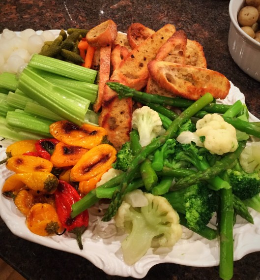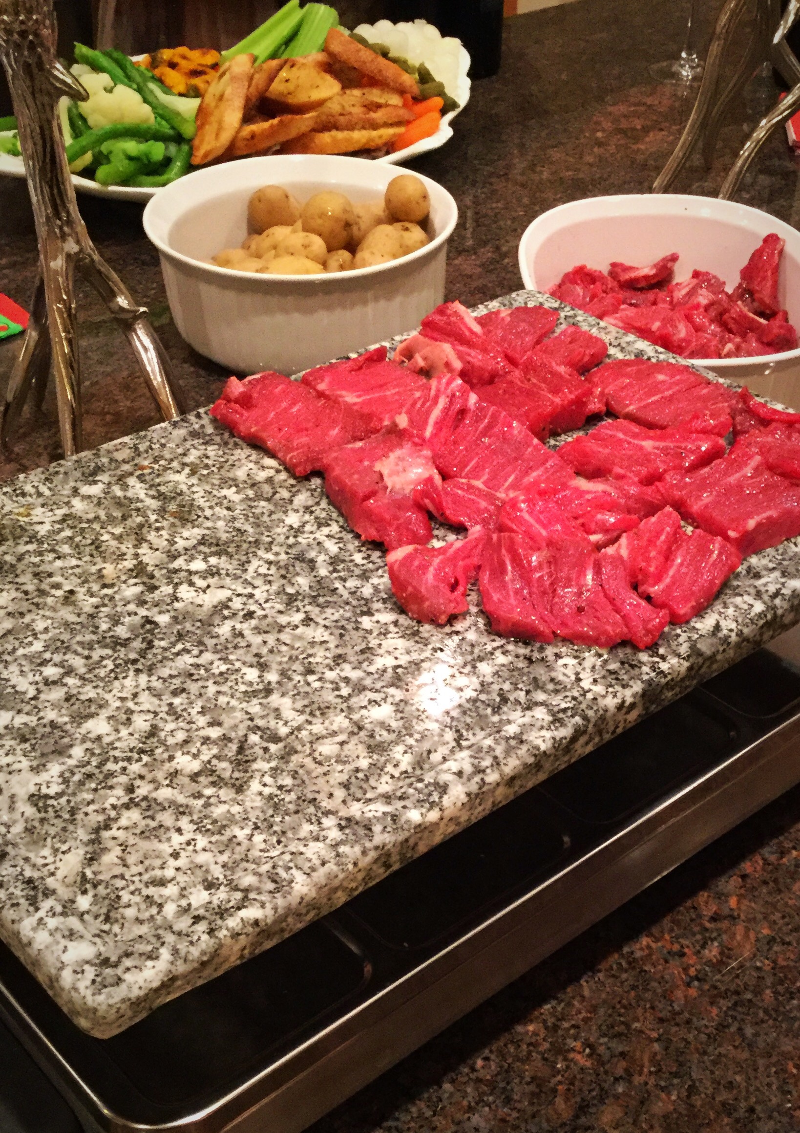 Anywhoo…we digress. Back to the evening at hand. The premise of fondue is simple, beautiful, and suits a variety of tastes and diets. In this particular case, we only used one piece of equipment, which serves up to eight, and grills, cooks and melts for you while you eat to your heart’s galore. Susan had this one and that’s what we are ordering.