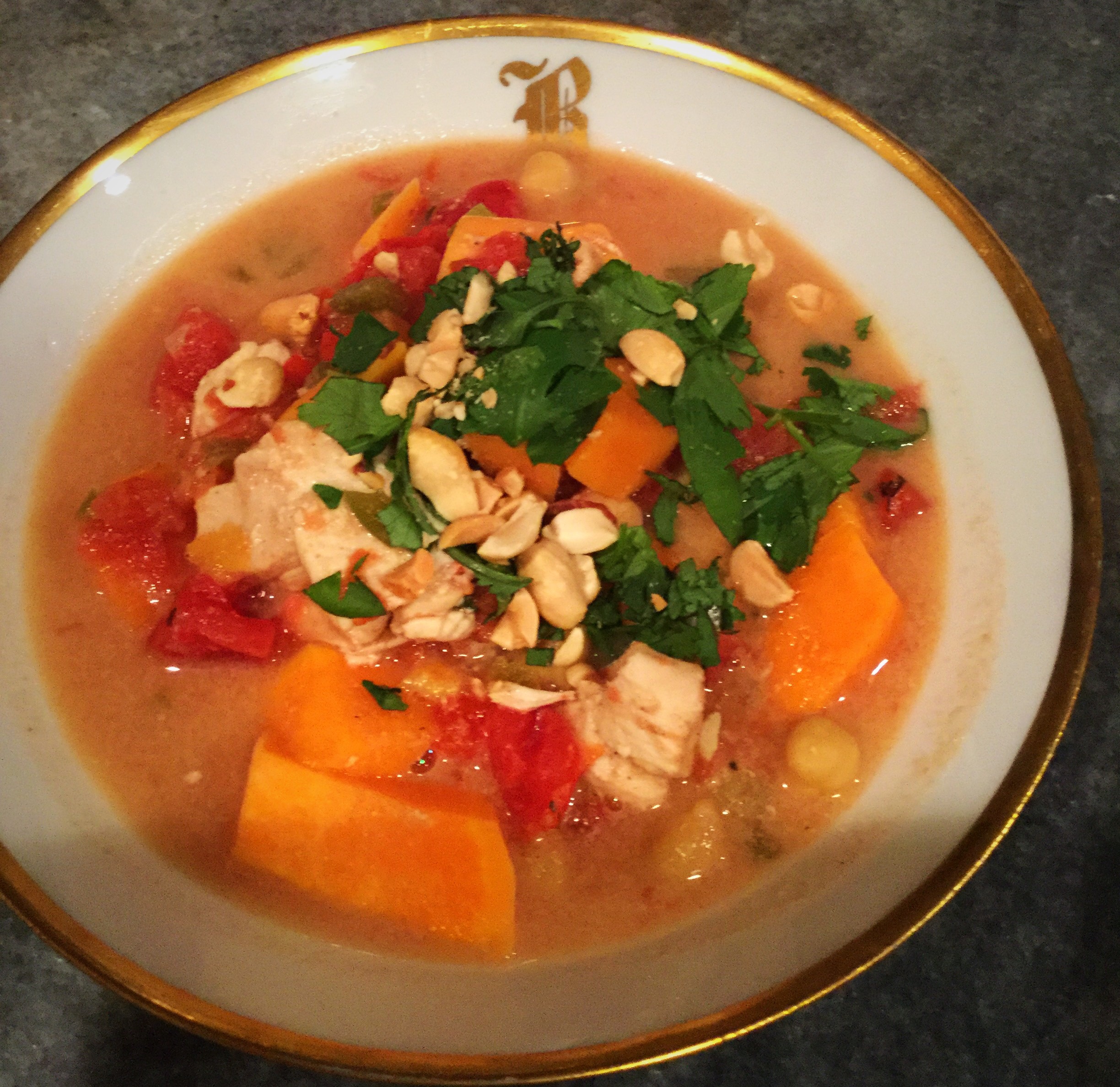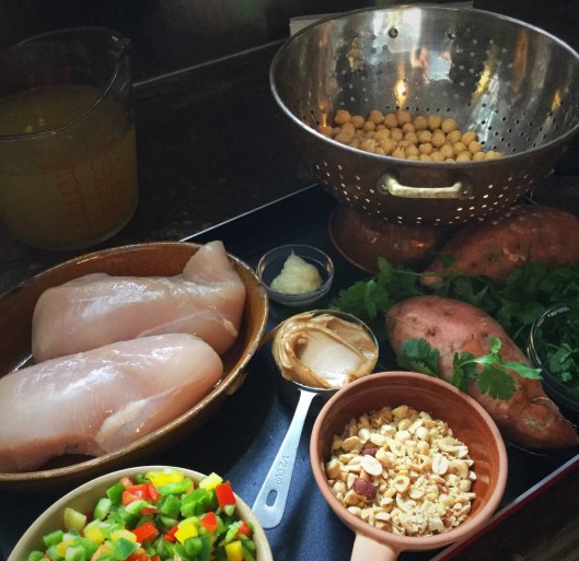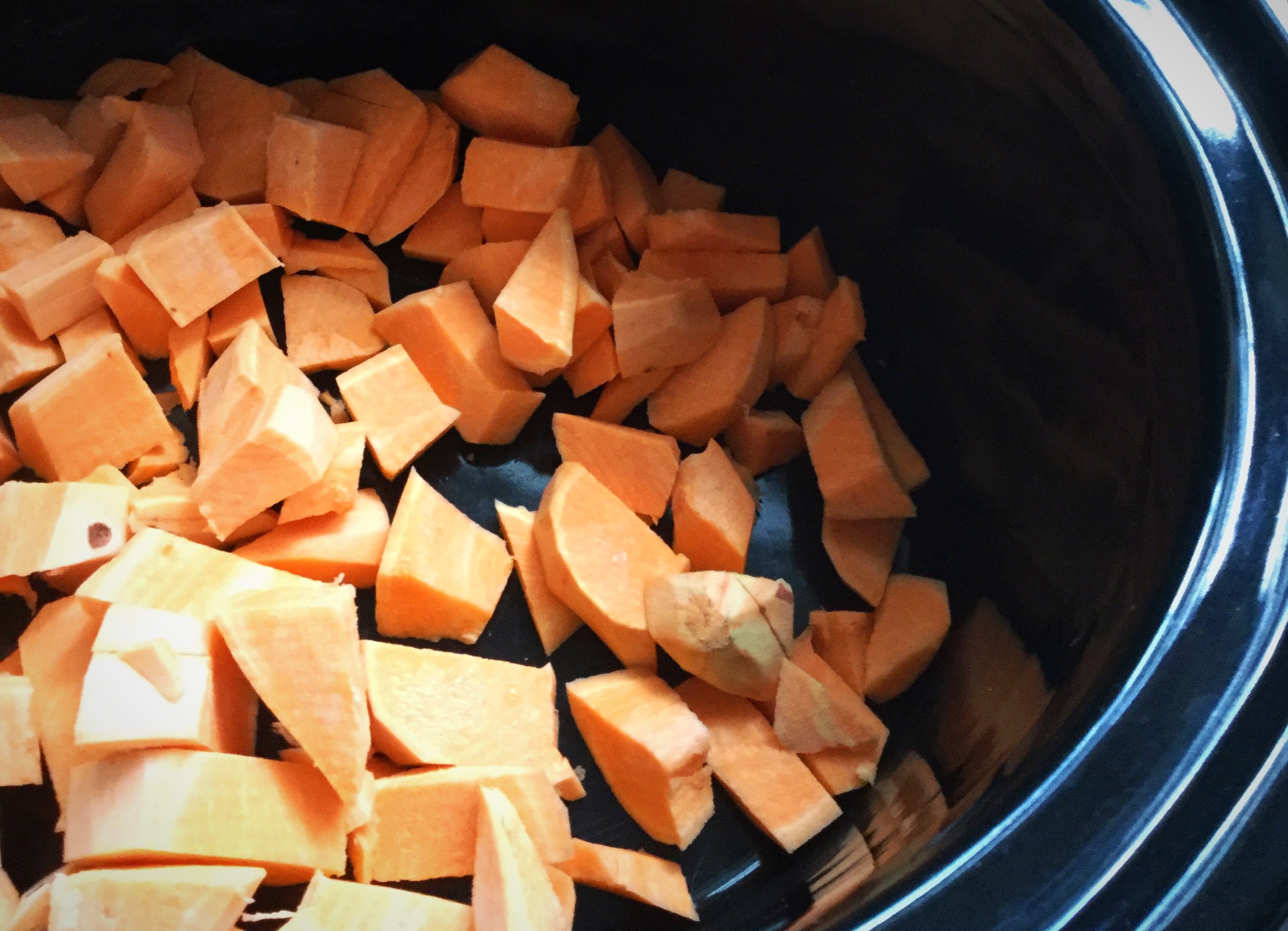 Place chicken, sweet potatoes, tomatoes, chickpeas, peppers, seasonings, garlic and broth into slow cooker. Cook on high 2 1/2 -3 hours (or 4-6 on low)