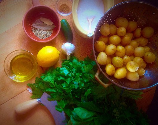 You start out with some baby new potatoes, a couple of handfuls of fresh herbs, garlic, lemon, and some olive oil, a jalapeño, salt and pepper