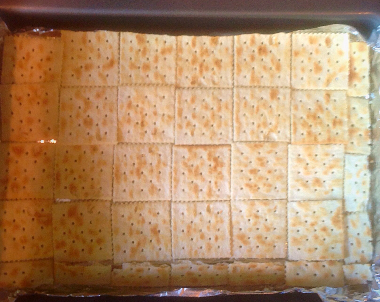 You line a pan with greasd foil and lay your saltines in a single layer.