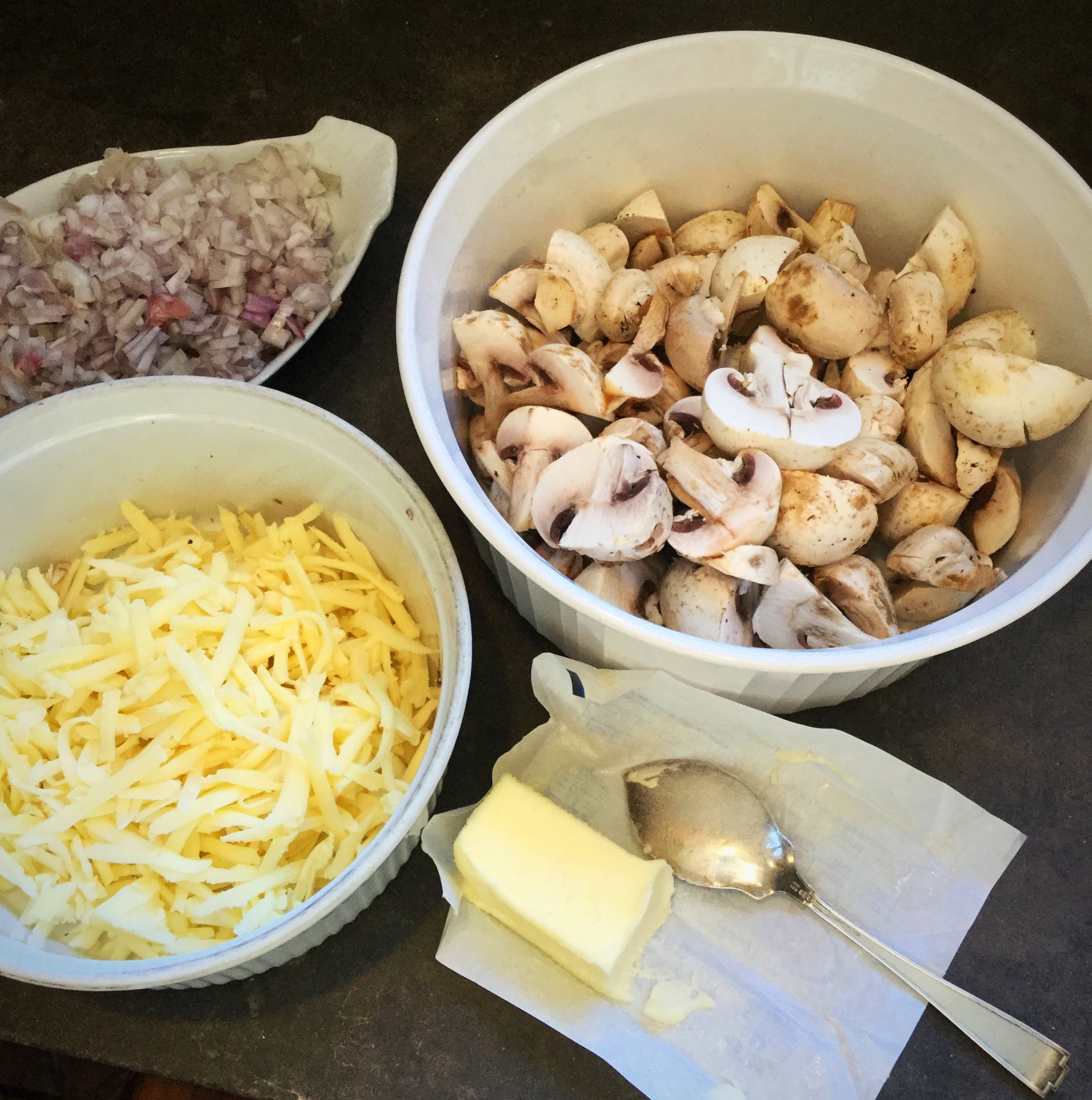 In a food processor mince mushrooms in two batches. In a 10 inch skillet (non stick) cook shallots in 2 tablespoons butter over moderate heat, stirring until golden. Add mushrooms with salt to taste and cook over moderate heat, stirring occasionally, until dark brown and very dry. About 15 minutes.