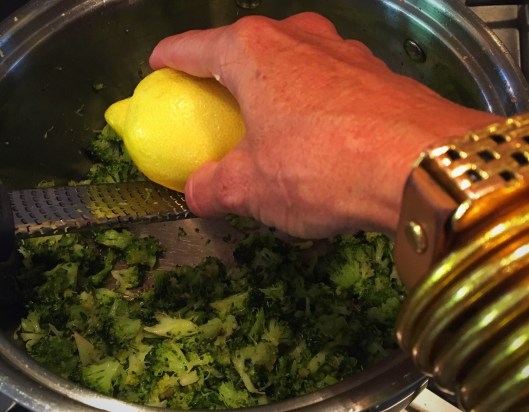 Add broccoli back to pot, then add lemon zest and juice (note the shameless plug for BuDhaGirl and Bezels & Bytes) 😉