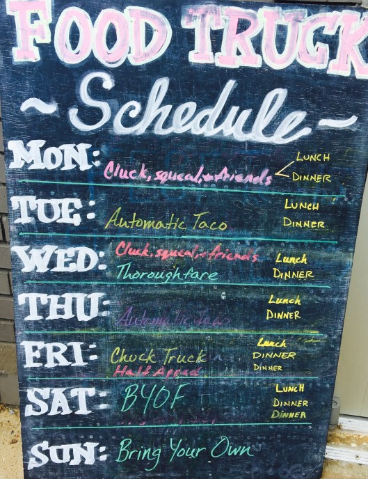 While TCT keeps a few, select nibbles on-hand (don’t miss the to-die-for Swamp Rabbit Cafe baguette – delivered fresh daily), Mike and Ed made the conscious decision to skip the food prep headaches in order to focus on what they do best…beer and wine. But never fear. Patrons have no excuse to leave hungry! These fellas schedule food trucks on the property every day except Sunday. Brilliant!