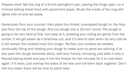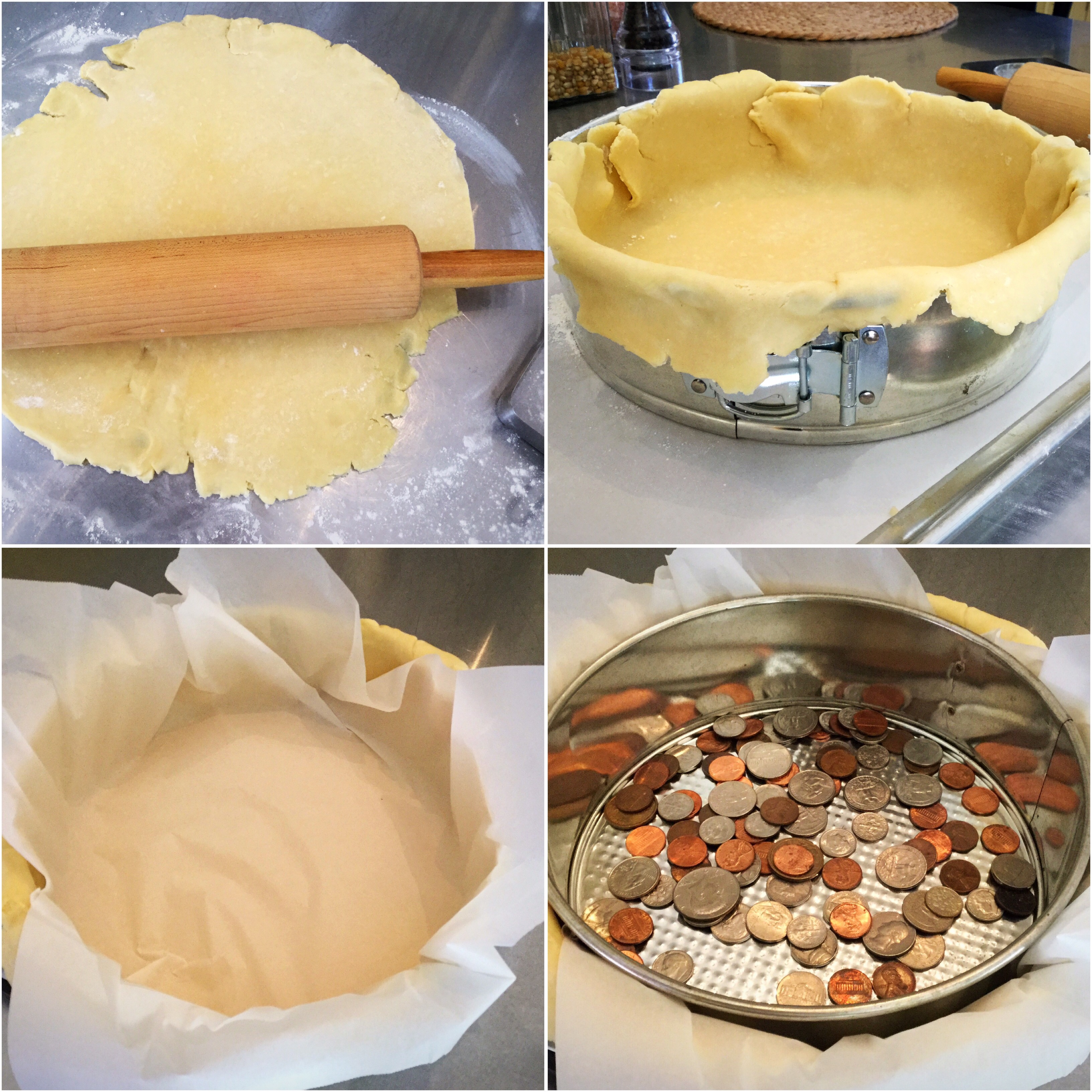 Roll out your dough.  It’s pretty stiff at first, but keep working…and keep it cold!!  Once you have a 16″ circle, place in the greased ring of a 9″ springform pan (no bottom, unhinged, on a parchment-lined cookie sheet).  Place parchment paper inside the dough and fill with weights (we used a slightly smaller springform with coins inside…Smitten Kitchen uses rice and/or beans) to keep the dough in place…otherwise, it will slide right down the sides of your springform and leave you devastingly disappointed!