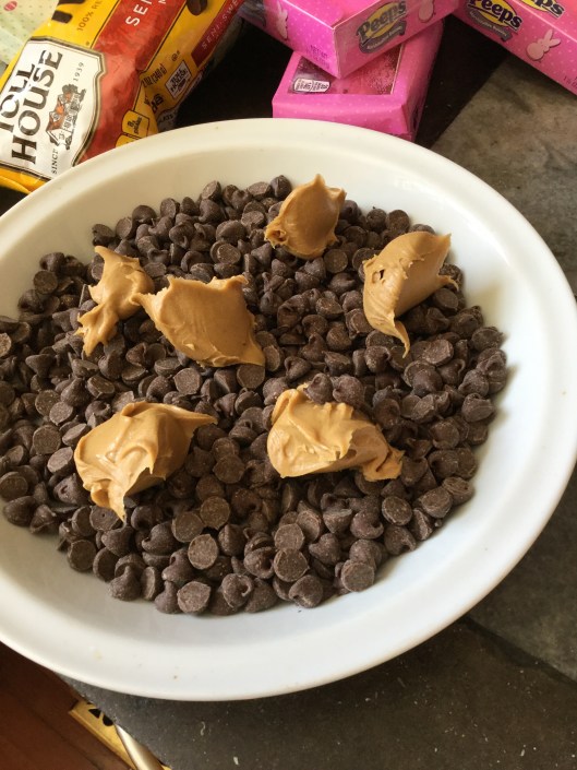 Then reach into your pantry and grab a bag of chocolate chips. We used semi-sweet because that’s what we had but feel free to mix or use milk, dark etc.