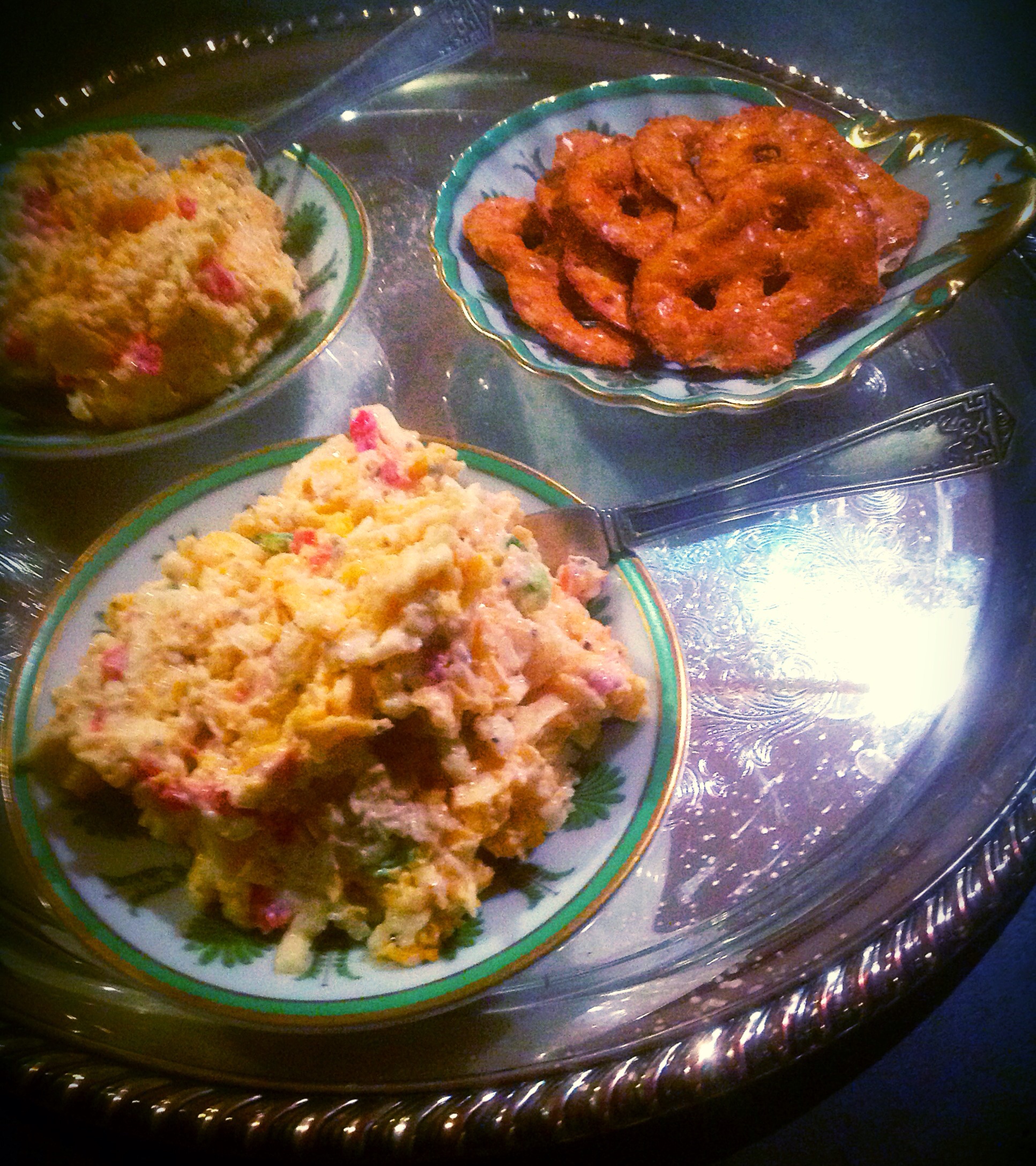 Next up…a to-die-for side dish. Here in the South, we can’t do without pimento cheese…evah!! We belles were recently in the midst of the truly southern James Farmer…more on that incredible experience to come (y’all know what they say, keep ’em wantin’ more!)