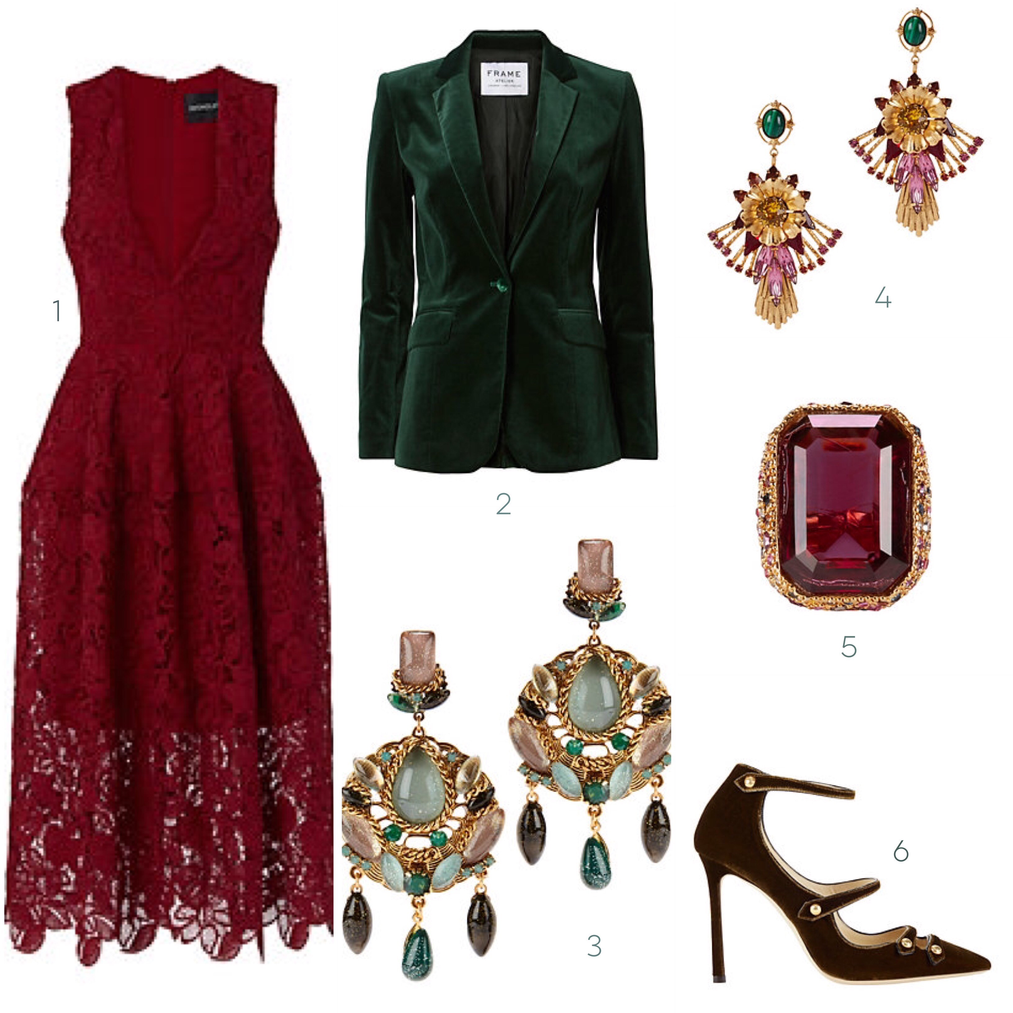 blazer, dress, earrings, Elizabeth Cole, Erickson Beamon, fall, fashion, frame, Jimmy Choo, kenneth jay lane, lace, Nicholas, ring, shoe, velvet