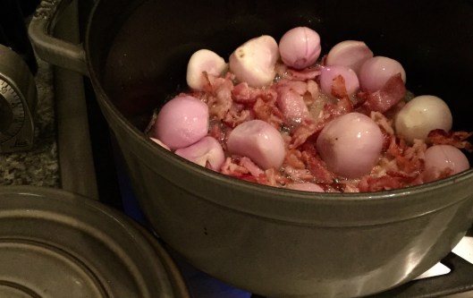 Add shallots and allow to cook with bacon for a couple of minutes. Transfer bacon and shallots to another dish