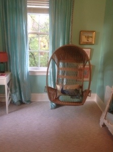We decided on Tiffany walls and coral accents. She was also insistent on having a hanging chair. Maybe she should be “determined” belle??