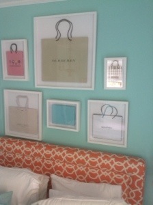 Next up was a way to fill up a large space above her bed. We framed a collection of shopping bags from stores that we love and covet. We even framed a flat Tiffany box for some added interest. This idea would be great in a dressing room or bathroom as well.